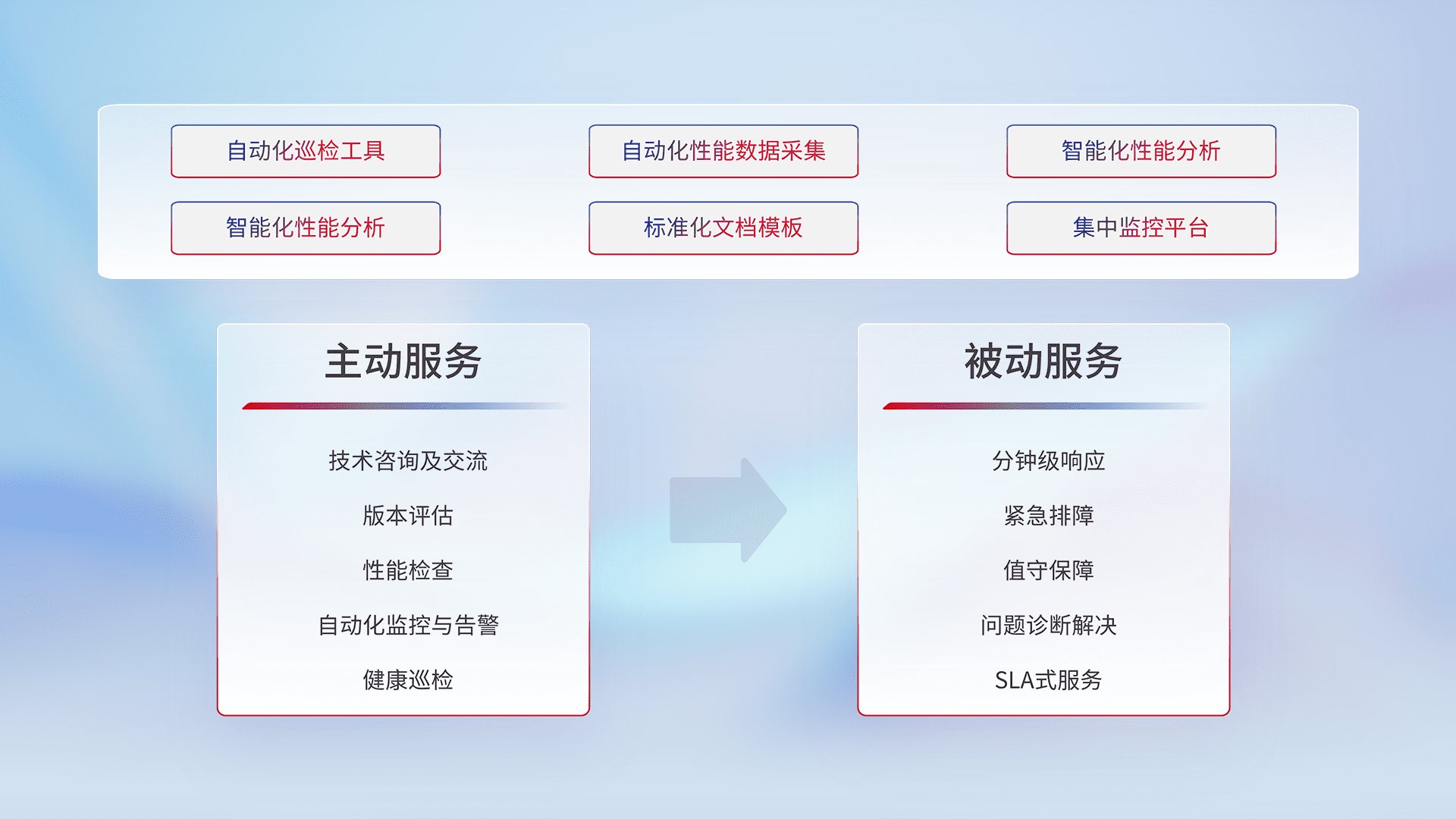 智能化工具和标准化文档,,保障服务质量,,,提供主动服务(包含技术咨询、、、、版本评估、、、性能检查、、、自动化监控与告警、、、、健康巡检)和被动服务包含(分钟级响应、、、、紧急排障、、值守保障、、、问题诊断解决、、SLA服务)。。